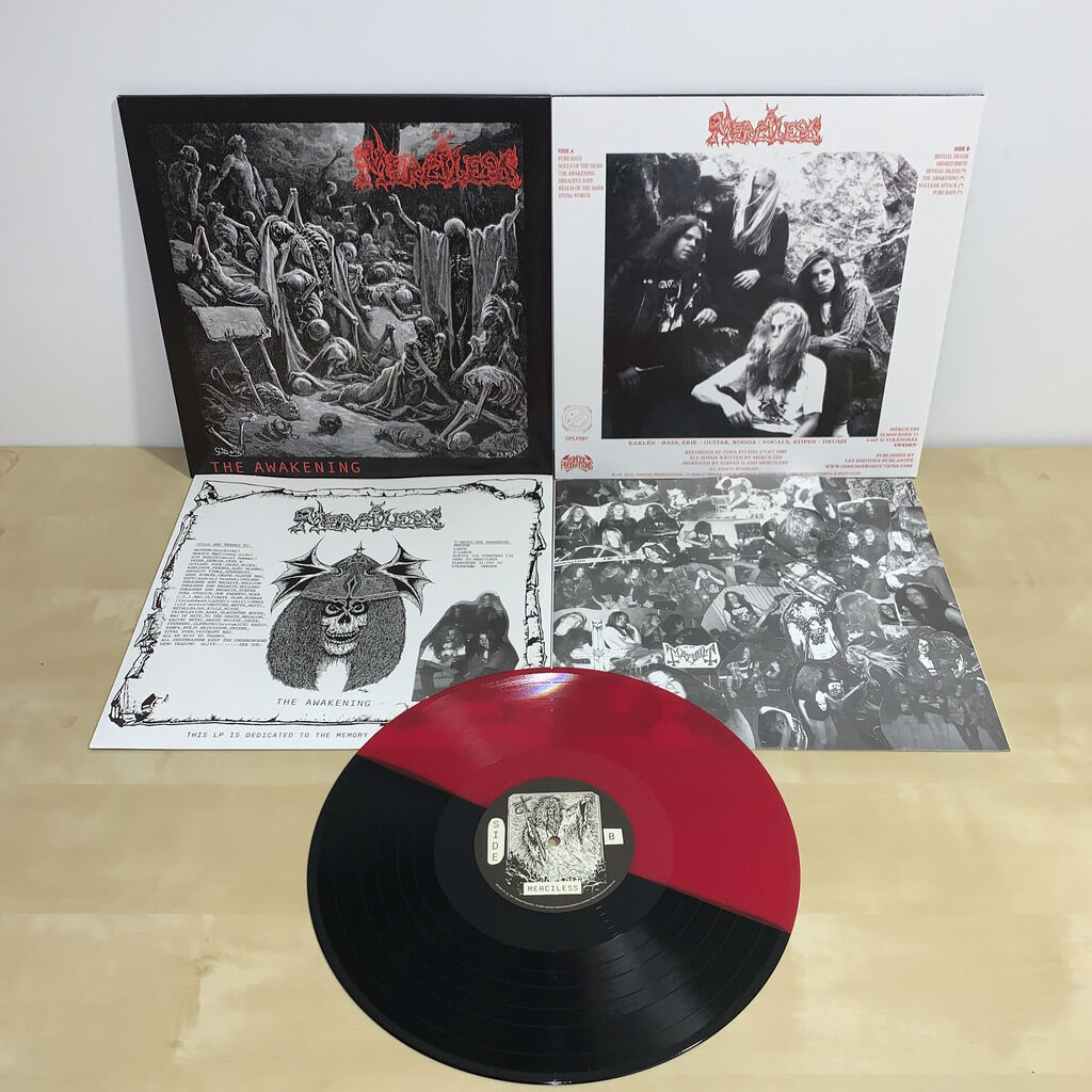 | MERCILESS | The Awakening | LP | SUE | Re-edición del 1er álbum ('90) de este total kulto al Death Thrash Metal primordial, aniquilador y bestial demonÍaco debut, incluye 4 temas en vivo en Uppsala (Suecia) '90. Limitado a 500 copias, VINILO ROJO/NEGRO. | Osmose Prods. | $ 130.000 / $ 33 us |